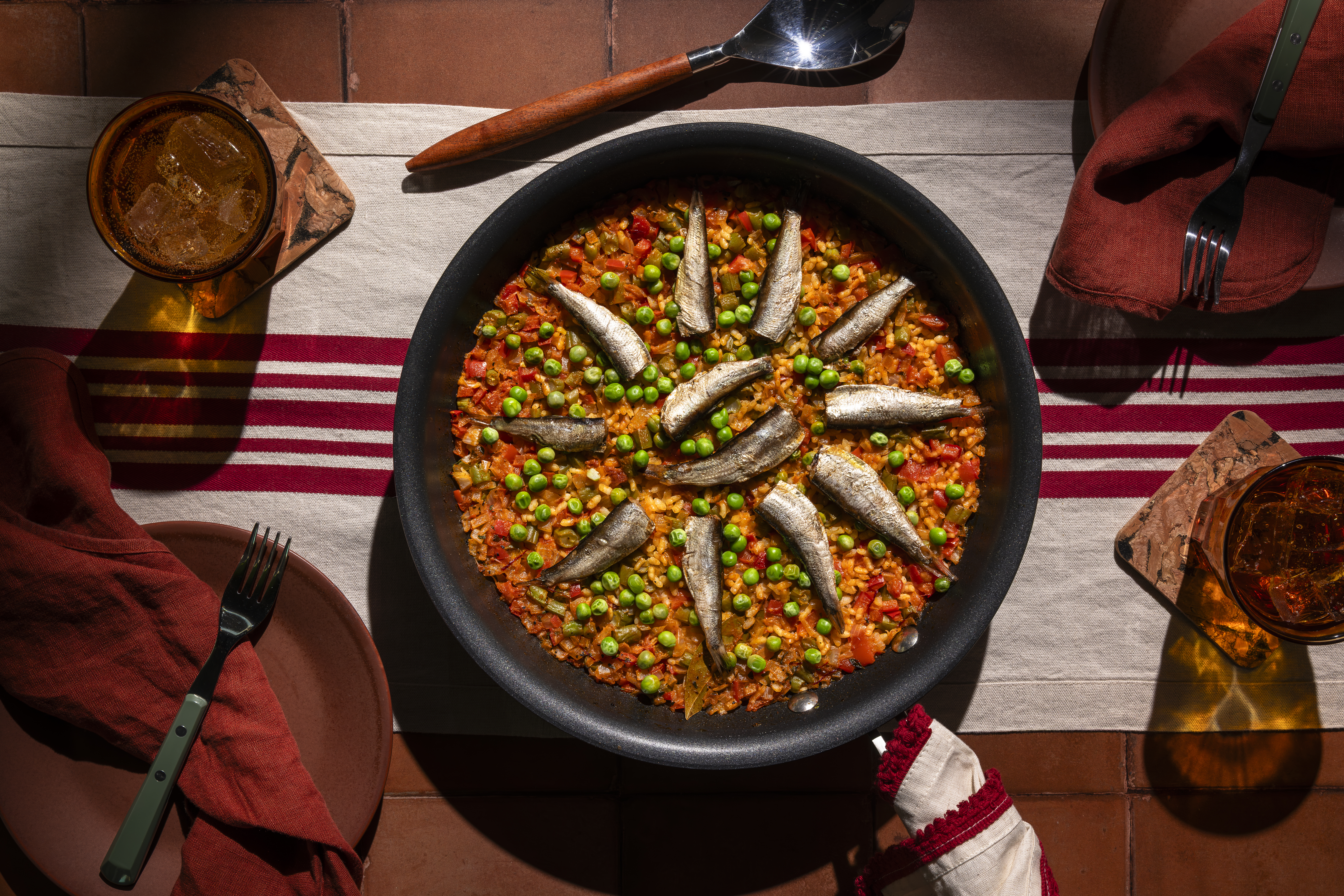 - Reduce heat to medium-low and arrange sardines and peas (if using) over top. Simmer until pretty much all the broth has been absorbed, about 5 minutes more.